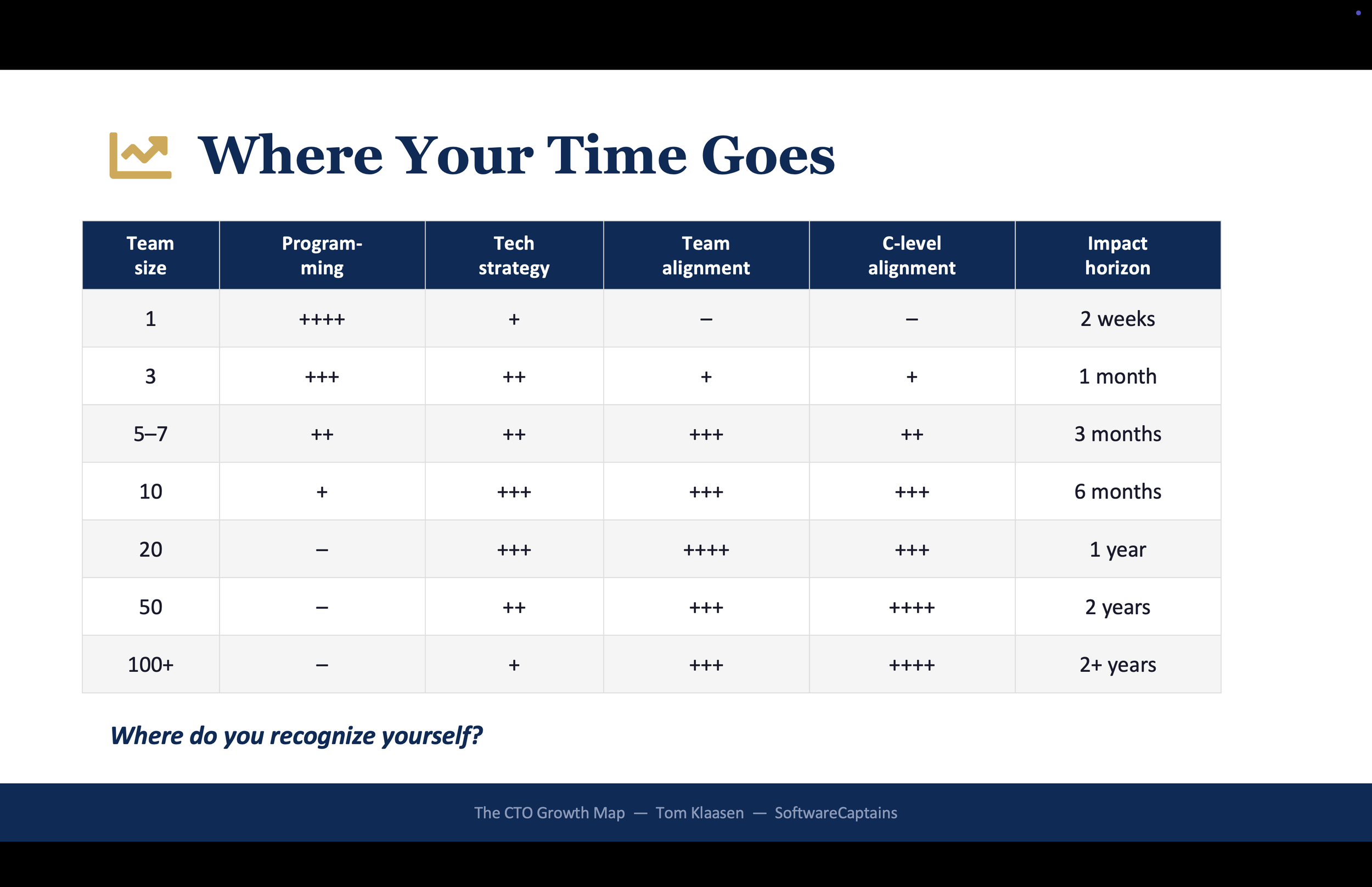 Als je een tech team van meer dan 50 mensen hebt, gaat je tijd vooral naar alignment.